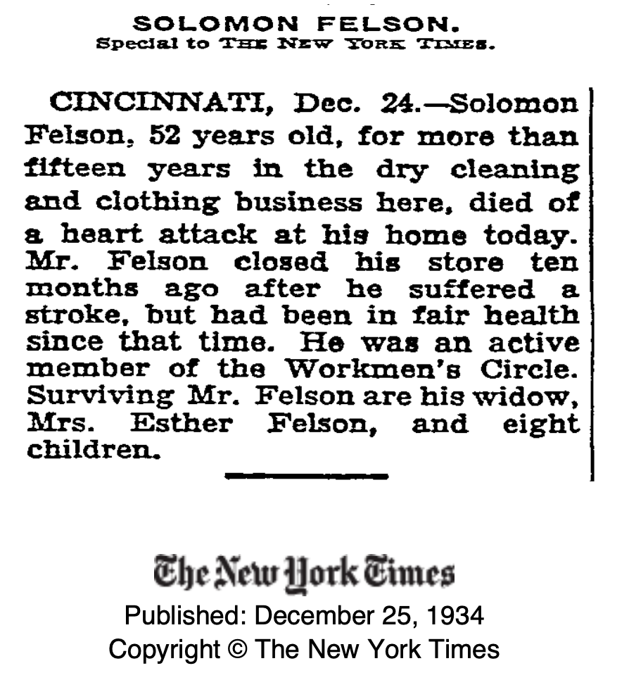 Sol’s longest stay in one workplace was at 1407 Central Avenue, a short walk from his family residence at 401 Hopkins St. The Cincinnati City Directories of 1917 to 1923 show Solomon Felson in this 1407 Central Avenue location.