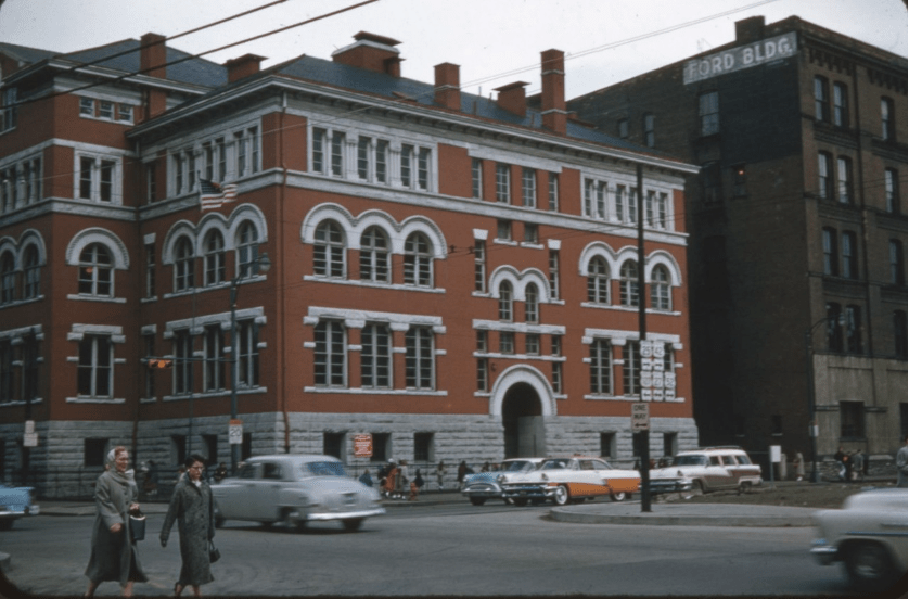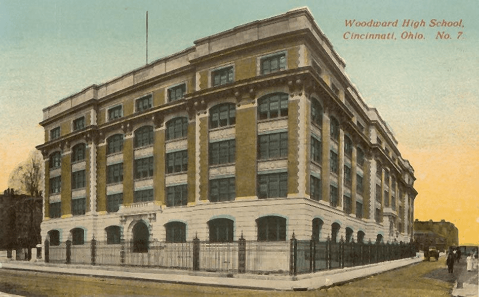 He went to old Woodward High School, located in the same area (picture below). It is called old because a school of the same name was built in Bond Hill, then the suburbs, and the old one closed or converted. I suspect he walked to both schools. The poor kids, including him, would ride for free by holding onto the back of the streetcar. (I found out lately that this is called “skitching, requiring skates or snowy weather to make sneakers slide.) It was dangerous. Also, from time to time the conductors would stop the streetcar and chase the kids away. So they had to wait for the next streetcar.