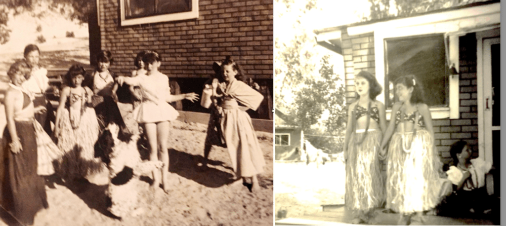 When the cousins came to visit at the Dunes, I remember we decided to put on a play for everyone. Our friends in the Dunes were also actors in the play. We decided we would invite all the nearby families and we invited everyone in the cottages around us and put the play on at our open porch. The “guests” sat in the sand. The storyline we came up with is that we were on a bus with other people from different foreign countries, and the bus broke down so we decided to entertain our selves while we were waiting. Lois and Julie were French dancers and I’m not sure but I think they also sang a song. Aunt Edie had sent hula hula skirts from Hawaii and Nancy and I were hula hula dancers, until my skirt fell down and I was offended when someone in the crowd whistled. Janie, you were wearing a sexy top and long skirt but I have forgotten what country you were from. Do you remember? To remind you, I have sent some pictures I found (see attached). My apologies for the poor quality. Anyway you all were very special to us growing up.