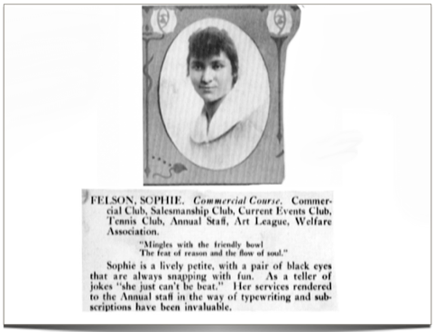 After the fire the family moved to Cincinnati proper. They were unsettled at this time, moving around as Sol tried to eke out a living. (Chippy pointed out several houses to Steve years later that the family lived in during this period.) The Felsons ended up on the West Side of Cincinnati at 410 Hopkins Street. Throughout this period Sophie attended Woodward High School. She graduated from Woodward in 1918.