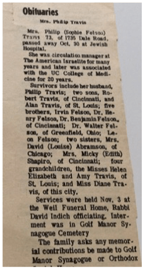Born in Warsaw, Poland in 1901. Joined her father, Solomon in America in 1904, along with her mother, Esther, and younger brother Irv. Lived in Newport, Kentucky for the next ten years. Graduated from Woodward High School in Cincinnati, Ohio in 1918. Married Phil Travis in 1922. Three children, Robert (Bob), Alan, and Helen. Helen died at 1 year of pneumonia. Also raised Paul Travis, the son of Phil’s brother whose mother died. Was Felson siblings’ caregiver throughout the depression. Secretary at American Israelite newspaper and then Cincinnati General Hospital Radiology Department (headed by brother Ben and, later, Jerry Wiot). A master knitter, cook, grower of African Violets, bridge player, typist, letter writer. Died of heart attack, 1974.